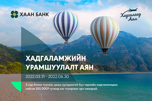 Ирээдүйн санхүүгийн аялалдаа яг одоо бэлдэж, хүсэл мөрөөдөл, төлөвлөгөө, зорилгодоо зориулан хадгаламж нээхийг хүсвэл, эсвэл амьдралд тулгарч болох гэнэтийн тохиолдолд хэрэг болох хуримтлалтай болмоор байвал ХААН Банкнаас харилцагч та бүхэндээ зориулан орон даяар зарласан "Хадгалаад аял” урамшуулалт аянд нэгдэхийг урьж байна.