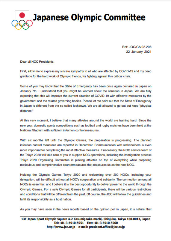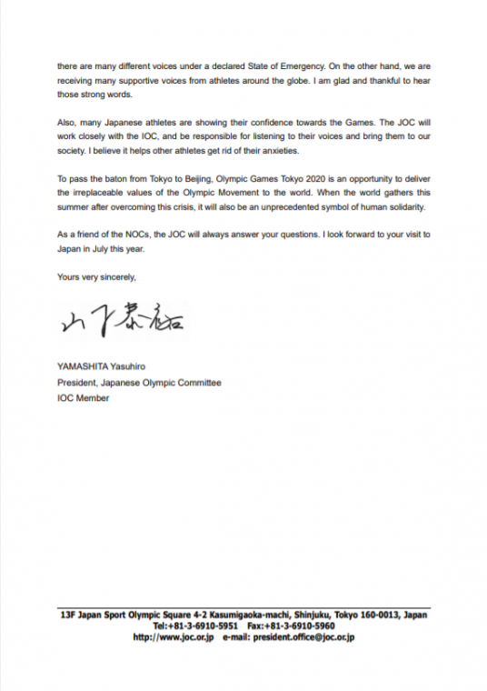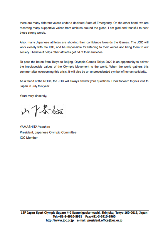 "TОКИО-2020" Зуны XXXII олимпийн наадам нээгдэхэд яг 6 сарын хугацаа үлдлээ. Үүнтэй холбогдуулан Японы үндэсний олимпийн хорооны Ерөнхийлөгч, Олон улсын олимпийн хорооны гишүүн, олимп-дэлхийн аварга жүдоч, домогт Ясүхиро Ямашита бүх Үндэсний Олимпийн Хороодод албан захидал илгээсэн байна. Уг захидалд "Цар тахлын амаргүй цаг үед үүний эсрэг тэмцэж буй даян дэлхийн олимпийн андууддаа талархаж буйгаа илэрхийлье. Энэ сарын долооны өдөр Японд онцгой байдал зарлан, цар тахалын хурцдалыг намжаахын төлөө зүтгэж байна. Орон орны тамирчдыг онцгой анхаарч, энэ үйл хэрэгт ҮОХ-дын тусламж дэмжлэг, хамтын ажиллагаа туйлын чухал. Зохион байгуулагч орны ҮОХ-ны хувьд бид Олимпийн наадмаа амжилттай зохион байгуулж, дэлхий дахинаа хүч чадлаа илтгэн харуулах итгэл төгс зорилттой. Япон улсад олон ургалч санаа бодол сонсогдож буй ч олон орны тамирчдын дэмжлэгийн дуу хоолой, олимпийн наадмын төлөө итгэл найдвар биднийг урамшуулж байна. Японы ҮОХ нь ОУОХ-той хамтран, тэдний дуу хоолойг нэгтгэн, нэгэн багийг бүрдүүлэх болно. Ингэснээр эргэлзэн түгшиж буй зарим тамирчдад тус дөхөм үзүүлэх нь дамжиггүй. "Токио-2020" олимп нь Олимпийн хөдөлгөөний үнэлж баршгүй үнэ цэнэтэй өв соёлыг хүн төрөлхтөнд хүргэх асар том боломж билээ. Та бүхэнтэй VII сард Япон улсад учран золгохын ерөөл тавья !" хэмээн дурьджээ