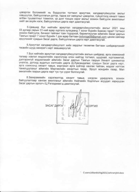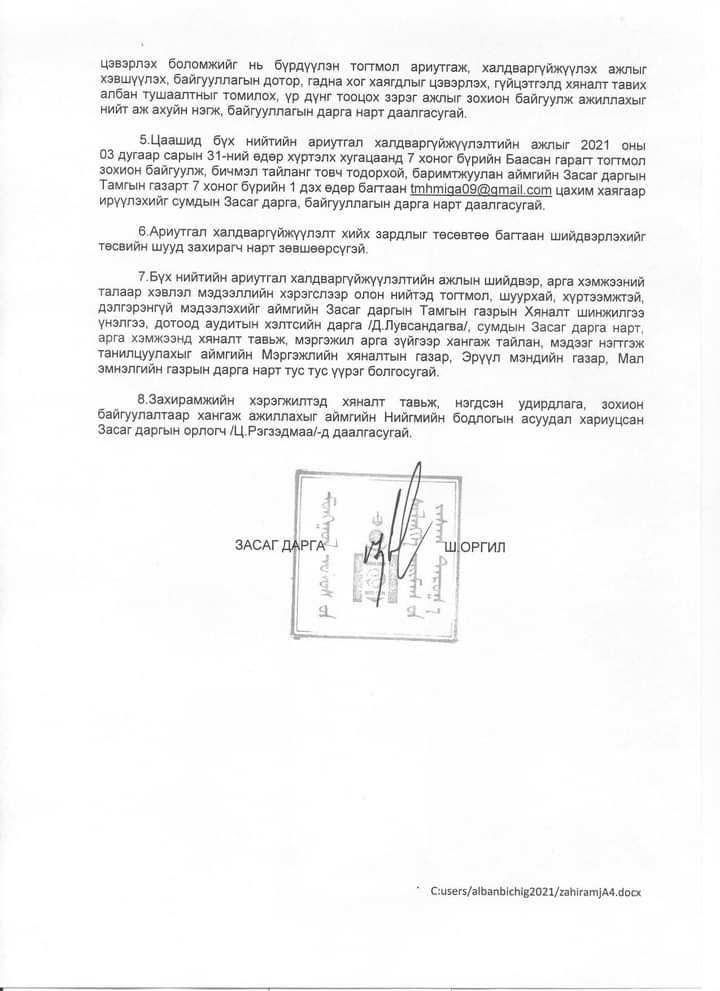Цаашид “Бүх нийтийн ариутгал халдваргүйжүүлэлтийнажлыг 3-р сарын 31-ний өдөр хүртэл 7 хоног бүрийн “БААСАН” гарагт тогтмол зохион байгуулж байх юм.