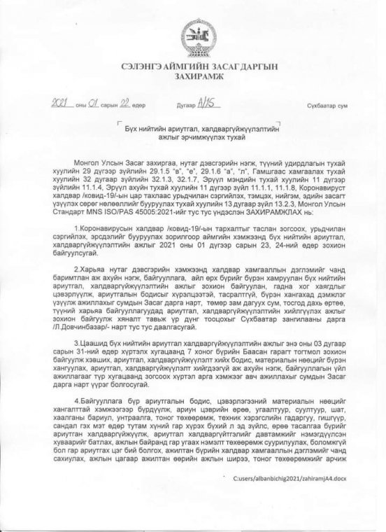 Сэлэнгэ аймгийн иргэдийн хувьд хүрсэн үр дүнгээ хамгаалах өндөр үүрэг хариуцлага ноогдож байгаа тул халдвар хамгааллын зөв дадал хэвшлийг тогтоох хэрэгтэй.