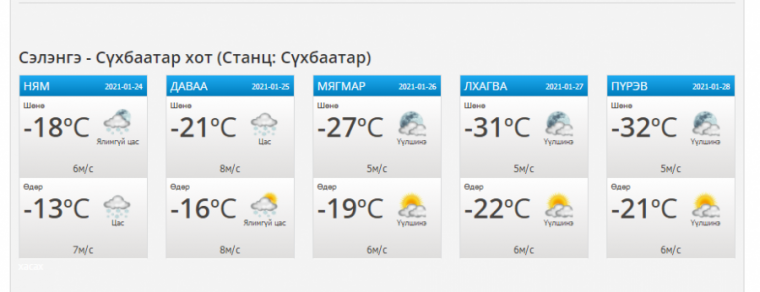 Мөн энэсарын 25-29-нийг хүртэлх 5 хоногийн цаг агаарын урьдчилсан мэдээгээр25-нд ихэнх сумын нутгаар цас орж, цасан шуурга шуурна. Салхи секундэд 7-12 метр. Бусад хугацаанд салхи баруунаас секундэд4-9метр. Агаарын температур шөнөдөө 19-24 градус, өдөртөө 9-14 градус хүйтэнбайна.26-наас шөнөдөө 31-36 градус, өдөртөө 19-24 градус хүйтэн байна.