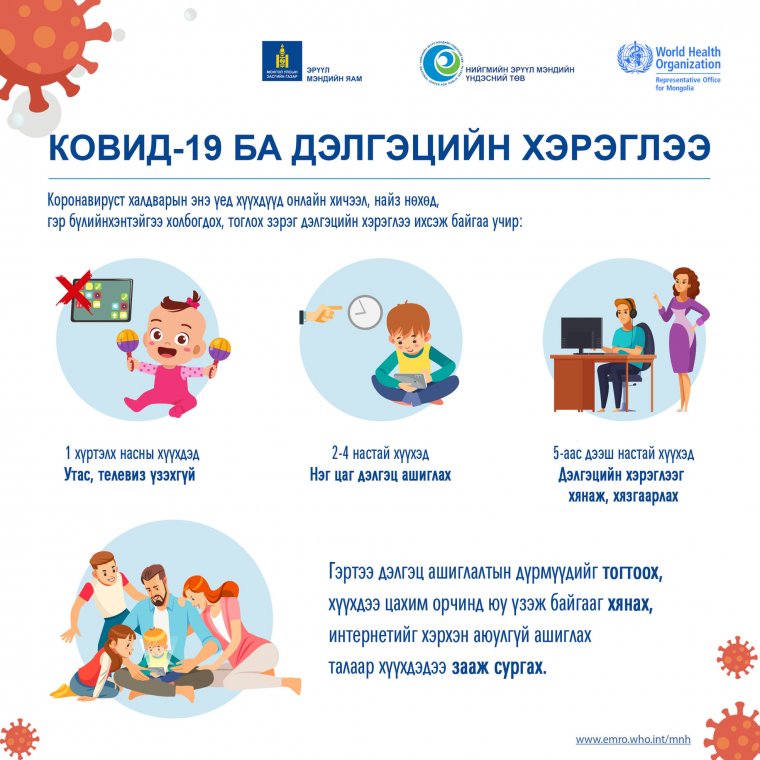 Коронавирусын халдварын тархалтаас сэргийлж хорио цээр, хөдөлгөөний хязгаарлалтын дэглэм тогтоосон байгаа энэ үед хүүхдүүд онлайн хичээл, найз нөхөд, гэр бүлийнхэнтэйгээ холбогдох, тоглох зэрэг дэлгэцийн хэрэглээ илт ихсэж байна. Иймд эцэг эх, асран хамгаалагчид та бүхэн гэртээ дэлгэц ашиглалтын дүрэм тогтоох, хүүхдээ цахим орчинд юу үзэж, ямар хүмүүстэй харилцаж байгааг хянах, интернет орчинд хэрхэн аюулгүй байх талаар зааж зөвлөж сургах хэрэгтэй