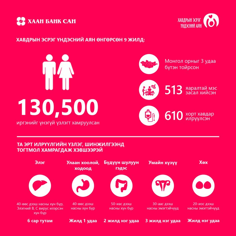 Хавдар судлалын үндэсний төвийн эмч нараар баг бүрдүүлэн ХААН Банк Сан болон МҮОНРТ өнгөрсөн 11 жилийн хугацаанд нийт 72440 км зам туулан, Монгол орноо гурван удаа бүтэн тойрохдоо одоогийн байдлаар 130 мянган иргэнийг урьдчилан сэргийлэх үзлэг, оношилгоонд үнэ төлбөргүй хамруулж, 600 гаруй хүн хавдраар өвдсөн гэдгээ эрт үедээ мэдэн эмчлүүлж, бүрэн эдгэрчээ. А.Уртнасан, Г.Мөнгөнцэцэг нарын үг бол тэдгээр 130 мянган иргэний төлөөлөл, ердөө хоёрхон хүний л талархал. Ганцхан хүний ард гэхэд л хайртай дотны хэчнээн зүрх элэг бүтэн жаргалаар бялхан үлдээ бол. ХСҮТ-өөс санаачлан ХААН Банк Сан, МҮОНРТ дэмжиж, хамтран хэрэгжүүлж буй нийгмийн сайн сайхны төлөө “Хавдрын эсрэг үндэсний аян”-д тус банк 1.2 тэрбум гаруй төгрөгийн санхүүжилт үзүүлээд байгаа аж. Энэ мөнгө заримд нь их, заримд нь бүр бага ч санагдаж магадгүй. Гэхдээ огт санаандгүй явж байсан 130 мянган иргэнд хүрч үйлчилсэн, 500 гаруй яаралтай мэс засал хийж эрдэнэт хүний амь насыг аварсан гээд энэ бүх хүний эргэн тойрны хэн болгонд урьдчилан сэргийлэх үзлэг ямар их ач тустай болохыг ойлгуулахад, эрт оношлуулснаар үлдсэн амьдралаа өвдөх зовлонгүй үргэлжлүүлэхэд нь зарцуулсан гэдэг утгаараа дүнгээр хэмжээлшгүй аз жаргалын том хөрөнгө оруулалт болжээ.